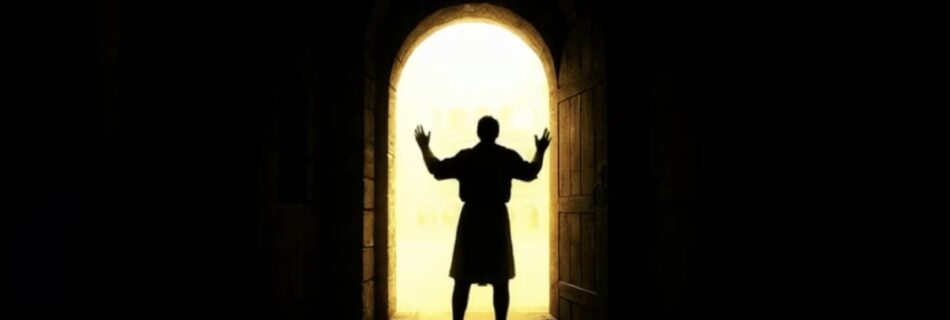 Having done all, he stands and lightly steps into the blood stained sands. The arch doorway feels no tremble in these hands…